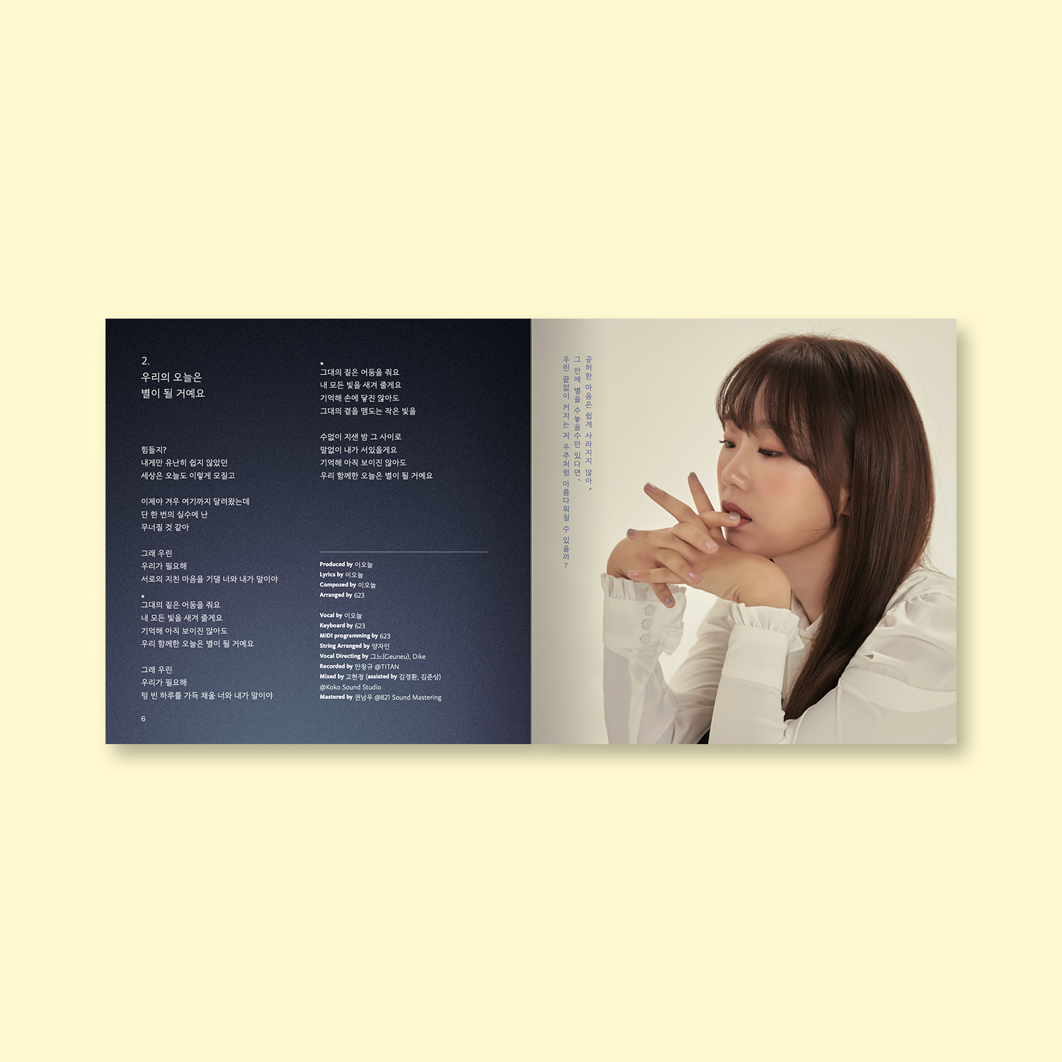 총 4곡의 수록곡 중 피아노의 잔잔한 울림에 스트링의 감성이 더해져 더욱 깊은 감동을 주는 타이틀곡 ‘우리의 오늘은 별이 될 거예요’는 내게만 유난히 쉽지 않은 것만 같은, 세상이 모질게만 느껴지는 사람들을 위로하고 응원하는 곡이다.